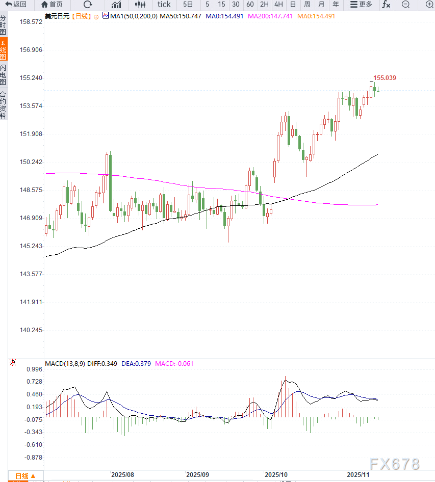 当前的美元兑日元结构呈现“政策偏宽松 vs 干预预期升温”的双重博弈。日本高层持续偏向低利率,使日元从政策面承压;但财政部门的警示性言论又使空头不得不收敛,使得汇率在155附近波动更趋谨慎。