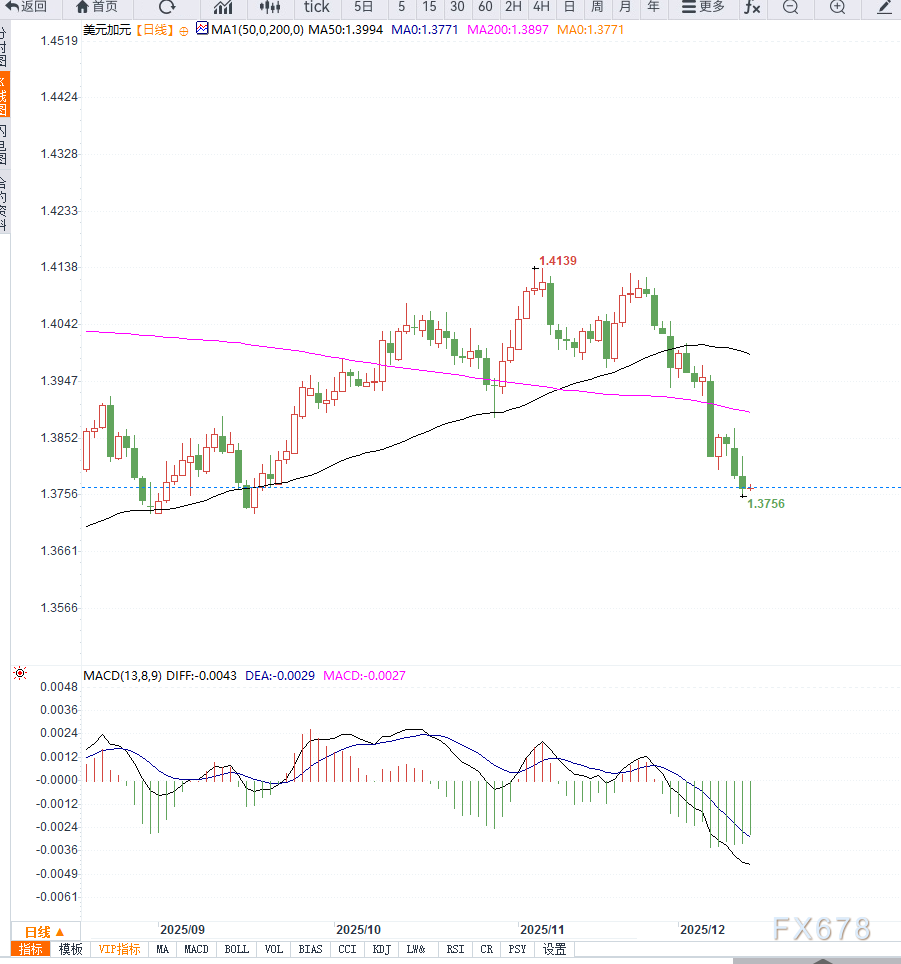 从日线图结构来看,美元兑加元处于明显的下行节奏,连续多日收在关键均线之下,显示空头力量仍处主导地位。