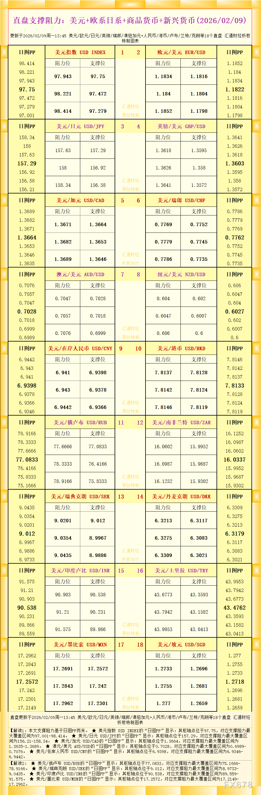 汇通财经APP讯——一张图看直盘支撑阻力:美元+欧系日系+商品货币+新兴货币,更新于2026年2月9日周一13:45